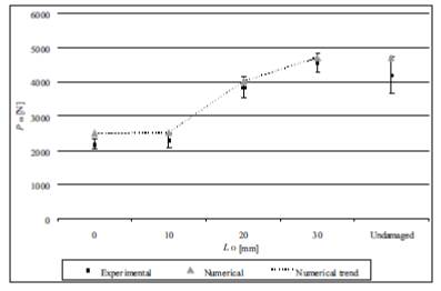 Na Figura 4 apresenta-se a evolução da força máxima (Pm) em função do comprimento de sobreposição LO. Mais uma vez se evidencia o bom comportamento do modelo numérico na previsão da resistência das reparações. Também se conclui que a reparação com LO =10 mm não propicia qualquer vantagem relativamente à viga não reparada. Por outro lado, constata-se que a reparação com LO=30 mm permite recuperar a resistência inicial da viga antes do dano, o que constitui um resultado importante.